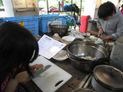 でも,次の活動が待っています。テントでシュラフの用意をした後は,野外炊事。火をおこし,おいしい食事作りをがんばります!