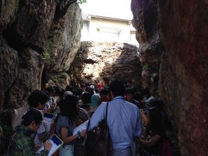 蛇塚古墳では,石室に入りました。6年生全員が入っても,まだ余裕があるくらいの広い石室です。蛇塚古墳にまつわるエピソードを聞き,しっかりメモをとる姿は,さすが6年生です。