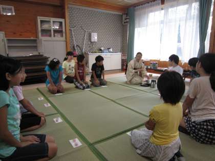 地域の先生に来ていただき,まずはお茶道具の名前を教えていただきました。そして,その後は,お手前の作法です。みんな正座し,背筋をピンと伸ばし,先生の手元をしっかり見ながら,話を聞いていました。凛とした空気が感じられました。