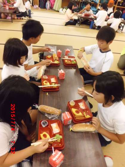 「きょうは磯観察に海へ行くよね。海はプールと一緒で,ちゃんとご飯を食べていない人はいけないかも…だっていつも朝食を食べたかどうかプールカードでチェックしているでしょ。」と話すと,ちょっと食べられない姿を見せていた人も,がんばってパンやおかずを口に運んでいました。