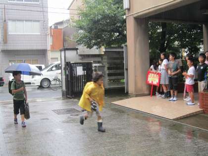 台風の影響で,雨降りの朝となった9月9日。雨でも,スマイルグループ「レッドシャイニングバード」の子どもたちの元気な「おはようございます!」というあいさつの声が学校の玄関に響いていました。