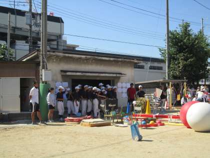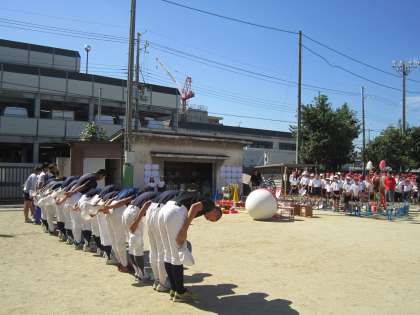 小中連携をすすめている九条中学校ブロック。運動会の日には,朝から九条中学校の野球部や生き方チャレンジに来ていた2年生が,応援やお手伝いに来てくれました。裏方の仕事をテキパキとこなし,最後には爽やかな挨拶でしめくくってくれました。