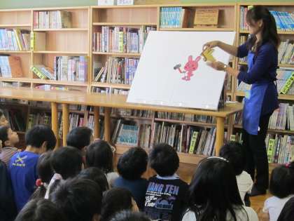 読書月間の取組の一つとして,図書支援員の先生による「パネルシアター」が行われました。放送を聞いて集まった1・2・3年生の子どもたち。お話が進むにつれ,白いパネルに動物やイスなどが貼られたり,動いたりする様子を見て,聞いて,お話の世界を楽しみました。