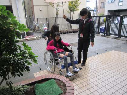 今日は,車いす体験をしました。段差のところでは,乗っている人に負担がかからないよう,そろりそろりと介助しました。