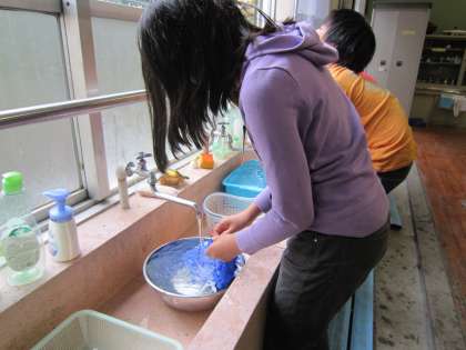 染め上がった布は,水にさらし,絞りをほどいていきます。一人ひとり違った,素敵な模様が見えてきました。