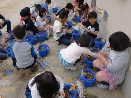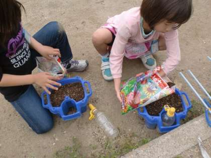 1年生の時に使っていたプランターを再利用して,土づくりと種まきをしました。夏の収穫に向けて,これから毎日,しっかりと水やりなどのお世話をしながら,大切に育てていきたいと思います。