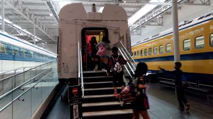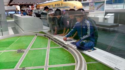 グループに分かれて見学しています。昔使われていた実際の車両が展示されています。切符を買って,改札を通る体験もでき,みんな楽しそうです。