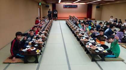 待ちに待った夕食です。お風呂に入ってさっぱりした子ども達。とっても豪華なお食事に感激しています。さあ!おなかいっぱい食べるぞ!