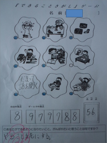 道徳の時間に「できることさがしゲーム」をしました。シャンプーをする・服をたたむ・朝自分で起きるといった9つの項目の中で,自分でできることに印をつけていきました。その後,友達のできること・できないことをゲームの中で交流していきました。学習の最後には,自分でできるようになりたいこと・がんばりたいことを一人一人が挙げました。「一人で起きられるようになりたい。」「整理整頓ができるようになりたい。」「時間を決めてゲームをしたい。」・・・など子ども達ができるようになりたいことは様々でした。この1年間で1人でできることが1つでも多く増やせるように頑張っていきましょうね。