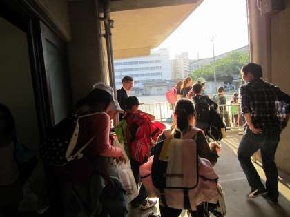 6年生が修学旅行から帰ってきました。バスから降りると,まず荷物を一つ運びます。さっと動ける6年生,さすがです。
