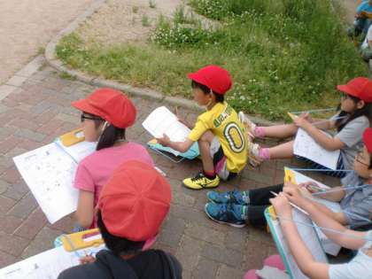 社会科では「学校のまわりのようす」を学習しています。 これまで学校の周りでよく行く場所や,紹介したい場所について教室で学習してきました。今日は,いよいよそれらを実際にこの目で確かめる「まちたんけん」に出かけました。