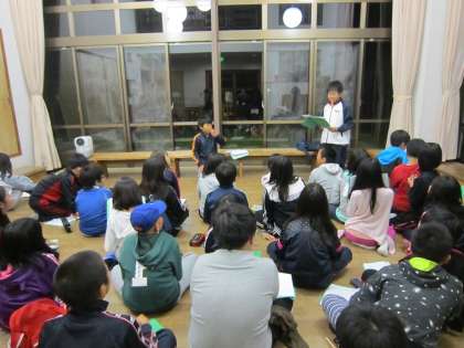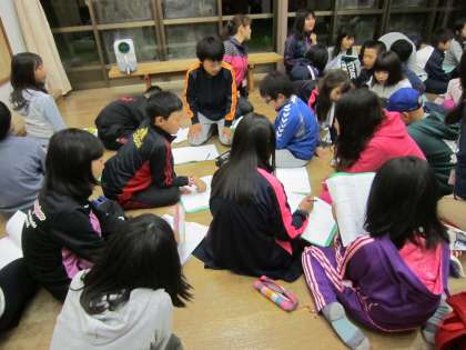 ナイトハイキングの後,反省会をしました。グループでがんばれたことや明日がんばりたいことを考え合い,みんなで交流しました。自分たちのことをしっかり見つめることができました。