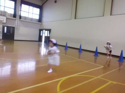 今日はあいにくの雨で,てつぼう運動はできませんでした。代わりに体育館で「体ほぐしの運動」をしました。初めに二人組で背中を合わせて背伸びをし合ったり,手をつかんで引っ張り合ったりしました。その後,二人・四人で腕を組んで背中合わせに座り,息を合わせて立つことに挑戦しました。これが初めはなかなか難しく,ペアの子と「せーの」と声をかけながら立とうとしていました。立てた時は「先生、立てたで!」と満面の笑みで友達と喜び合っていました。次に,新聞紙を使って「新聞紙リレー」をしました。これはグループでの協力が必要になってきます。走る際の向かい風を利用して,新聞紙を体に巻きつけて走ります。途中で新聞紙が落ちたら拾って,次の人へとバトン代わりに新聞紙を渡していくというものです。どのチームも声をからしながら友達を応援していました。最後に,ペアで「新聞じゃんけん」をしました。先生とじゃんけんをして,あいこになったり負けたりしたら新聞紙を一回たたみます。ペアで協力したり工夫したりしながら,新聞紙から落ちないようにするというものです。じゃんけんの勝敗に一喜一憂する子ども達。「落ちる〜!」といいながらペアの子におんぶをされる子もいました。友達と協力をすることで様々なことに挑戦できたり楽しめたりします。またできたらいいですね。