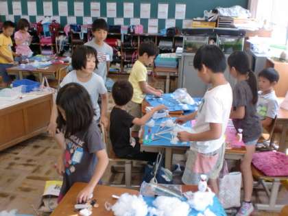 図画工作科「ざいりょうからひらめき」の学習で,身の回りにある材料を集めて,想像したことやひらめいたことなどを,絵に表す活動をしました。