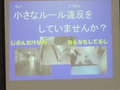 警察の方にお聞きるすると,子どもが関わった交通事故の中には,子ども側にも交通ルール違反がある事故も少なくないはそうです。一人ひとりの心の中にある「自分だけなら・・・」「みんなもしているし・・・」という『きけんのタネ』を取り除き,安全に安心して過ごせるようにしていくことの大切さについて考え合う機会になりました。