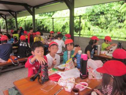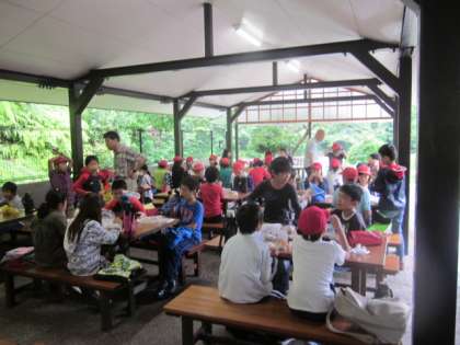 野外炊事場の横でお弁当です。おなかがへっていたので元気もりもりになりました。子供たちは元気です。