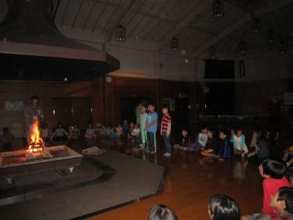 真っ暗な中,キャンプファイヤーがスタートしました。音の神の演奏で,火の神と火の子が登場し,ファイヤーに点火しました。