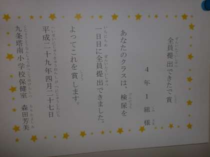 なんと,森田先生が掲示板に「全員提出できたで賞」を飾ってくれていました。