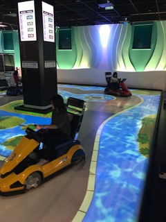 テクノサーキットという,床に映った上のコースを運転することにより,自動車の「走る」「曲がる」「止まる」を体験できるコーナーが子どもたちに人気です。