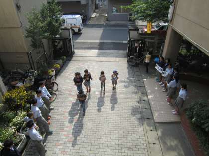 小中一貫教育の取組のひとつ「小中あいさつ運動」に九条中学3年生の子どもたちが,九条塔南小学校に来てくれました。登校前に集合し,校門と区役所前の2か所に分かれ,登校してくる小学生や行きかう人々に,さわやかな朝の挨拶を届けてくれました。