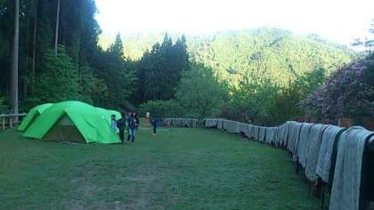 おはようございます。3日目の朝です。空はカラッと晴れています。テントで寝た子どもたちは、洗顔したあと、自分たちが使ったシュラフ干しです。