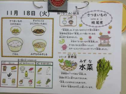 「さつまいもの栂尾煮」は、京都市にある「栂尾」という地域にある高山寺で生まれた郷土料理だそうです。和(なごみ)献立の時には、料理が紹介されている動画を見て学びます。京菜ともいわれる水菜も、京野菜の一つです。旬をたくさん味わいました。