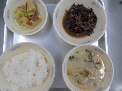 今日は和(なごみ)献立は【ごはん、水菜の味噌汁、牛肉とひじきの炒め煮、さつまいもの栂尾煮】でした。