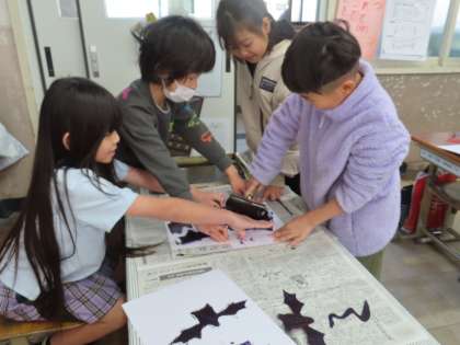 版画用のローラーを使った場合と、水彩絵の具を使った場合で、色や写りの具合が変わることに子ども達は気付くことができていました。