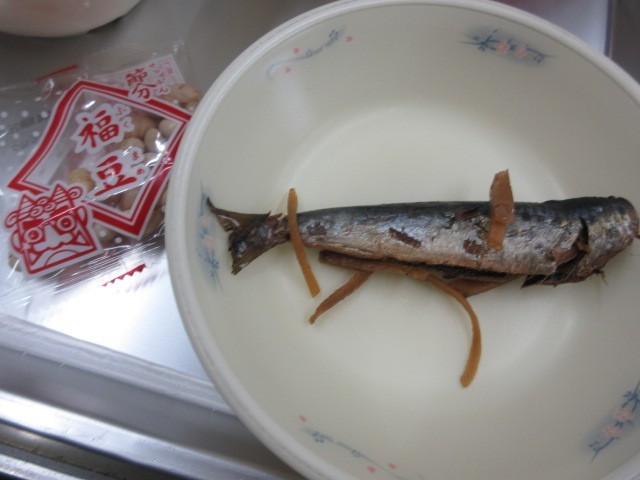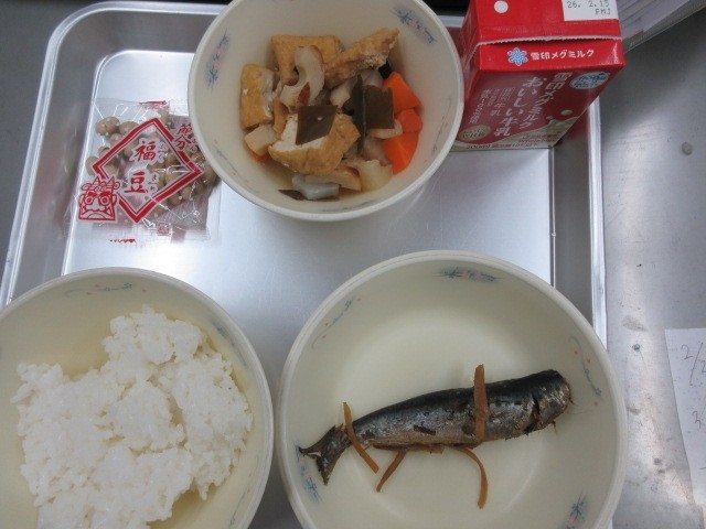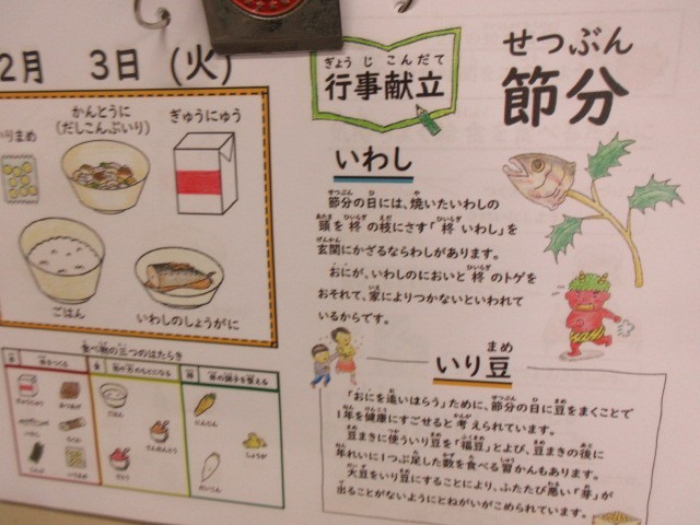 「いわしのしょうが煮」は、骨まで柔らかく、食べやすかったです。「いり豆」は、自分の歳の数を数えながら食べる子どもたちの姿がありました。きっとお家でも、恵方巻を食べたり、豆をまいたりして、節分を楽しんだかと思います。