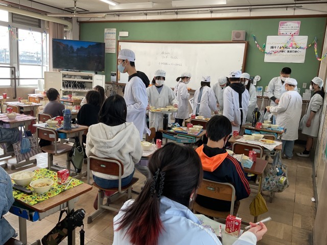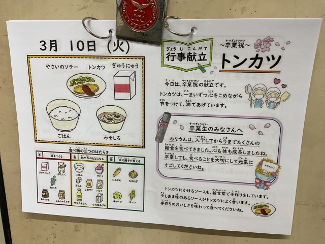 給食でとんかつが出ることは子どもたちにとっては大事件、とてもすごいことなのです。6年生の卒業のお祝いにと、給食調理員さんが一枚一枚、給食室で揚げてくださりました。6年生は、給食当番をすることも、給食をみんなで食べることも後少し。