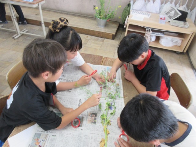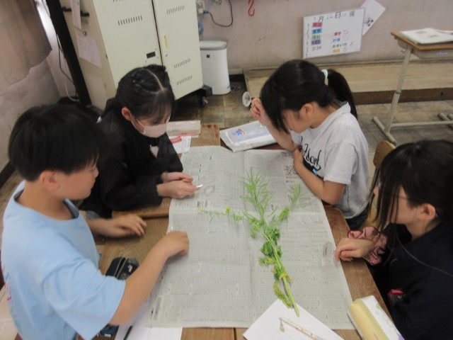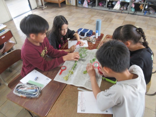 むしめがねをうまく使いながら、「実」のある場所を探しました。いろいろな植物比べて、共通点を探し、花のつくりについて知りました。