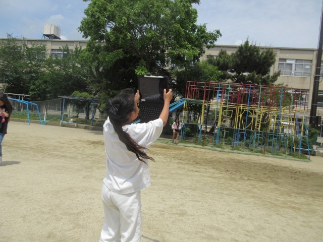 雲の動きについて調べています。実際に外にでてみると、虹がかかっていました。珍しい空の姿に大喜びしている子どもたちでした。