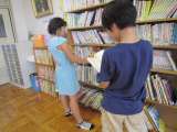 図書室では,夏休みに読書する本を1人3冊貸し出ししています。みんな本を手に取り...