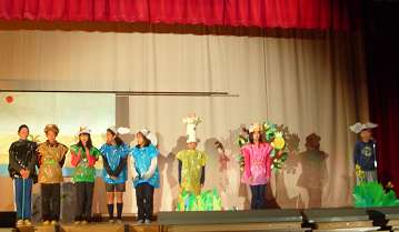 昔は今より短かったというぞうの鼻。何でも知りたがりやのぞうの子がお話を進めていきます。ダチョウやキリン,コロコロ鳥などに出会い最後にワニに食べられそうになって鼻が伸びていきます。鼻が伸びるところをどうしたらいいか,いろいろ考えて表現しました。エンディングの歌に合わせてみんなで踊るところは,会場の子ども達も声と手拍子で応援しました。