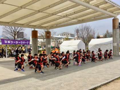 梅小路公園のツーデーウォークの会場で,3,4年の有志が運動会で練習した舞2017とソーラン節を披露しました。児童館もダンスで出演しました。