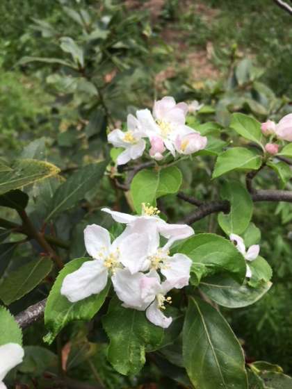 校庭にアケビ、ヒメリンゴ、ヤマモモの花が咲いています。