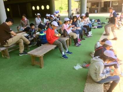 交流の森の中にある森愛館の前でお弁当を食べています。