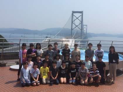 鳴門海峡大橋記念館エディに着きました。見えているのが淡路島と四国を結ぶ大鳴門橋です。この記念館では,本四架橋(明石海峡・鳴門海峡ルート 瀬戸大橋ルート しまなみ海道ルート)の工事の様子などを学習します。