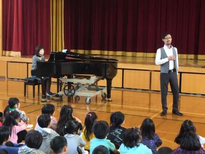 文化庁の派遣事業で,声楽家の服部先生とピアニストの片岡先生がオペラのミニコンサートを低学年にして頂いています。この後,10時45分から体育館で全校合唱の指導もして頂きます。よければご参観ください。