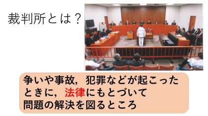 これまで,「国会」「内閣」の働きについては勉強しましたね。もう一つ,国の政治の中で大切なのは「裁判所」です。