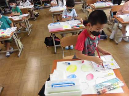 先週は,絵の具の道具の名前や使い方について学習しました。今週は,色を混ぜることにも挑戦し,自分で描いた風船に思い思いの色をぬりました。