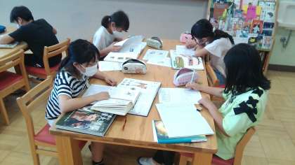 図書室にやってきて,たくさんの絵を探しています。