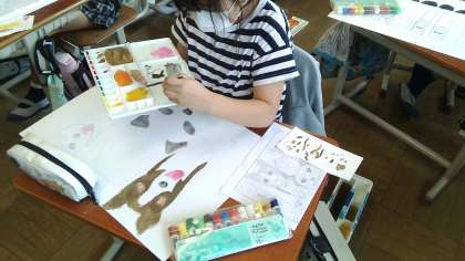 お話の絵に挑戦しています。パレットで作った色を,別の画用紙で確かめながら,色付けをしています。