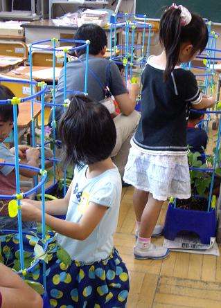 6月26日,1年生の生活科の研究授業でした。1・2年の研究テーマは『自分のおもいをもって活動し,体感や気づきを通して,自然とふれあいを楽しむ子』です。授業では今育てているアサガオに着いているつぼみに着目し,観察し,気づいたことを発表したり記録したりするというところでした。