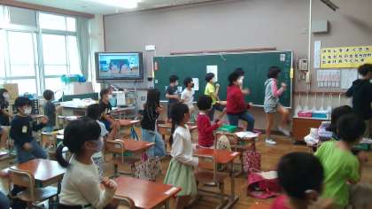 1年生の教室にダンスを教えに行っています。例年なら全校ダンスで,運動会の開会式後に踊っているダンスです。今年は一緒にできないのが残念ですが,がんばって覚えてほしいです。