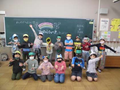 画用紙で作ったわっかに,かざりつけをして,ファッションショーをしました。みんなでポーズを決めて,写真も撮りました。