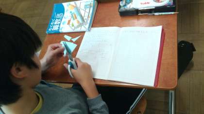 台形を2枚,上下を入れ替えて平行四辺形を作りました。台形の面積は,平行四辺形の面積の半分になる,ということを思いつきました。ほかには,台形を2つの三角形に切り分け,合わせれば台形の面積が求められることにも気づきました。