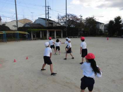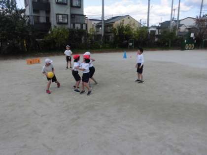 体育科では,エンドボールの単元で,パスの仕方を工夫して,チームで協力しながら得点を取る活動をしています。作戦を考えたり,声を掛け合いながらどうすれば得点が取れるかを工夫しながら頑張っています。