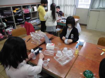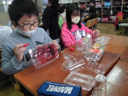 図画工作科の「クリスタルアニマル」の学習では,透明のプラスチックをつなげてオリジナルの動物をつくっています。最後にライトアップするので子どもたちはとても楽しみにしています。