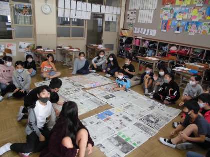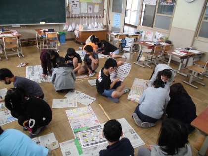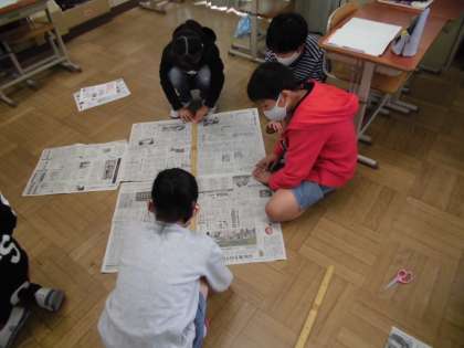 算数科の面積の学習で,1平方メートルがどのくらいの大きさか体感するために,新聞紙を使ってグループごとに1平方メートルを作りました。子どもたちは,1m定規で新聞紙の長さを測り,グループで協力しながら作り上げていました。でき上がってみると,「1平方メートルって思ったより広いな。」と驚いていました。